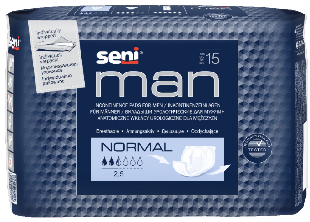 Анатомическая форма обеспечивает оптимальное прилегание к телу, а впитывающий слой с антибактериальным суперабсорбентом — предотвращает возникновение неприятного запаха. Система EDS, которая используется в прокладках Seni Man Normal, гарантирует быстрое поглощение влаги и обеспечивает чувство сухости и комфорта. Гидрофобные боковые бортики — дополнительная защита от протекания.