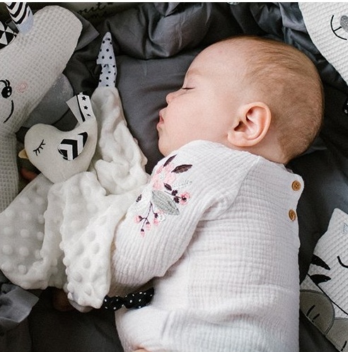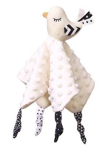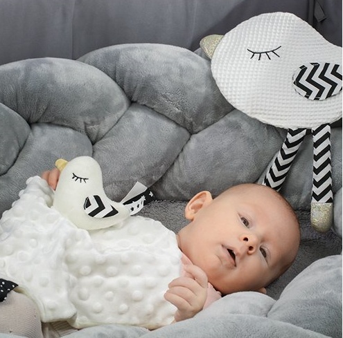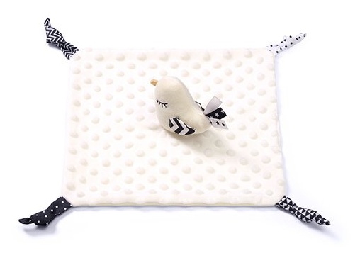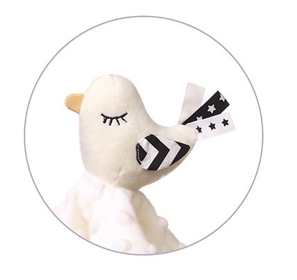 Little Birdie - это функциональное изделие "два в одном": пледик и игрушка-обнимашка. Кроме того, это еще и развивающая игрушка. Она развивает чувства малыша с первых дней жизни. Хлопковый материал минки имеет текстуру с мелкими ворсинками, которая стимулирует чувство осязания. Точно так же мягкие узелки и ленточки способствуют тренировке хватания. Материал дышащий и мягкий.