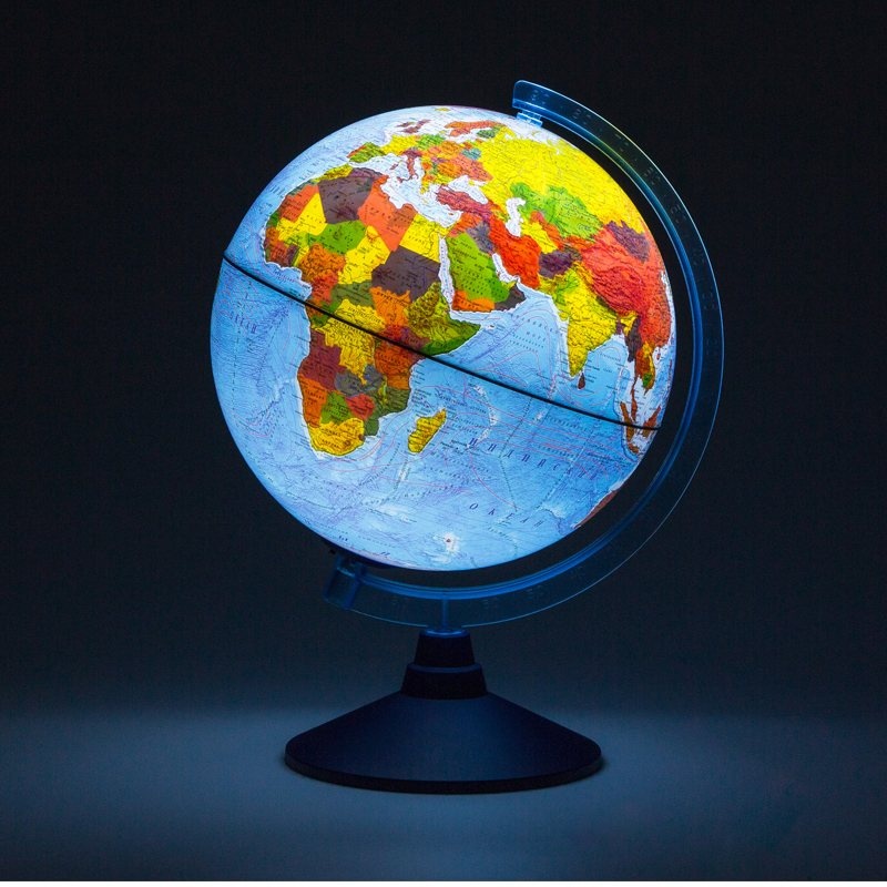 Глобус включает в себя две карты: с выключенной подсветкой вы видите физическую карту мира, при включении подсветки – политическую карту мира. Это делает глобус практичным и долговечным в использовании – пригодится школьнику для изучения окружающего мира, географии, истории и экономики. Размер глобуса 25 см, достаточно крупный с хорошо читаемыми надписями, удобен для размещения на рабочем столе. Глобус имеет подсветку, что позволяет комфортно использовать его в темное время суток. Подсветка от батареек абсолютно безопасна – можно использовать глобус в качестве ночника. Подсветка работает от двух батареек АА, в комплект с глобусом не входят. Использованные батарейки внутри сферы при необходимости легко заменить. Глобус выполнен из прочного высококачественного пластика с соблюдением всех современных технологий. Упакован в фирменную подарочную коробку.