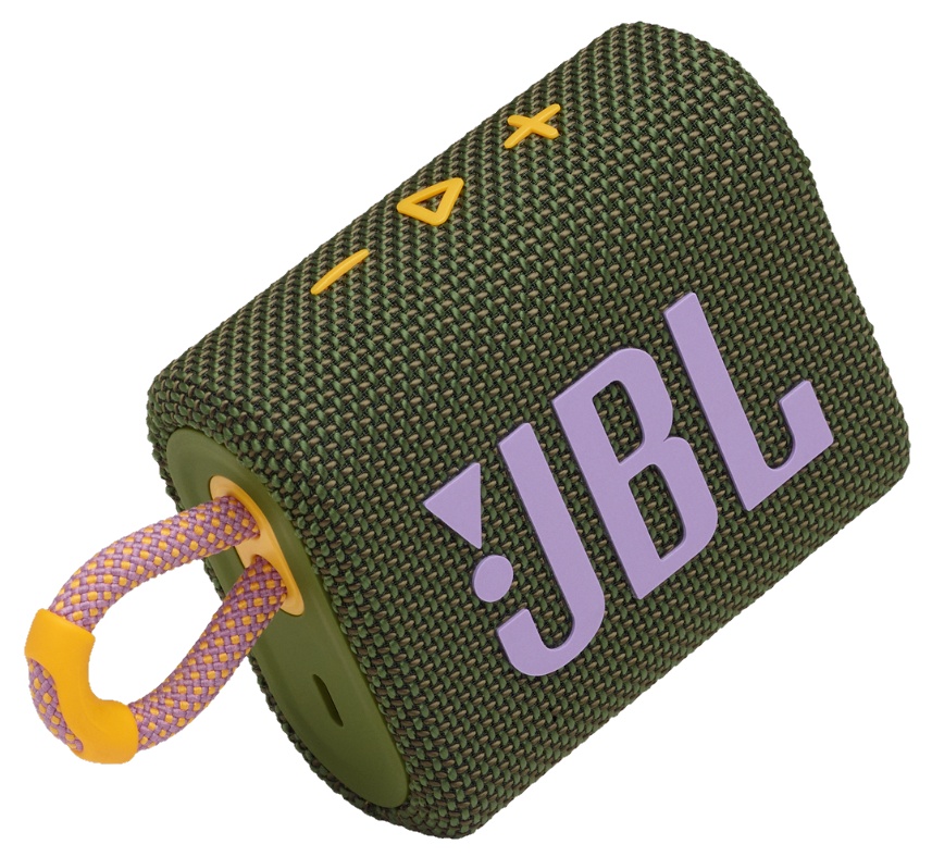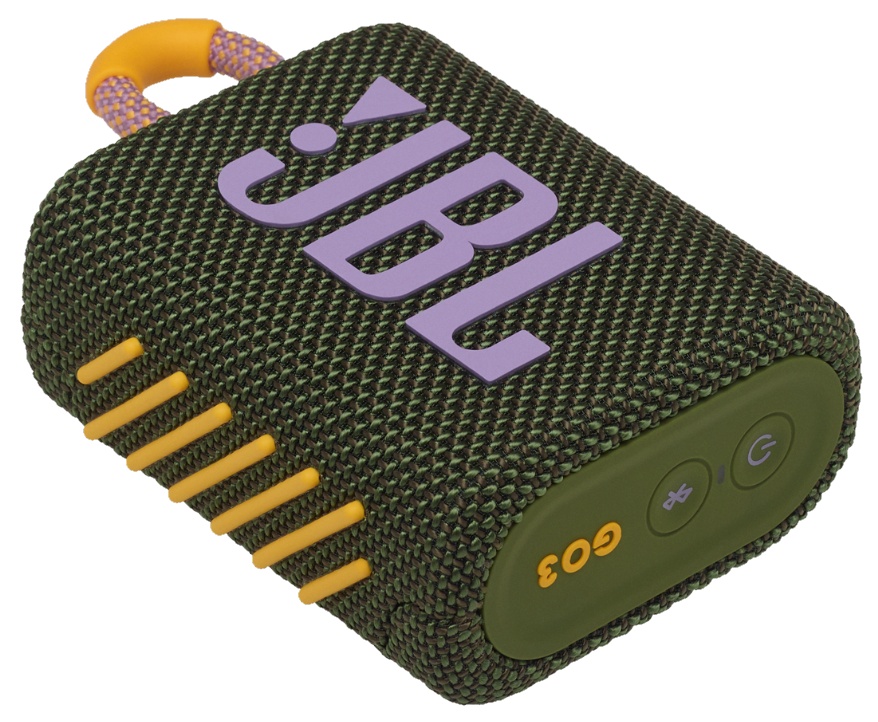 В ультракомпактном стильном корпусе JBL Go 3 удачно сочетаются разноцветная ткань и выразительные детали — колонка выглядит так же великолепно, как и звучит.