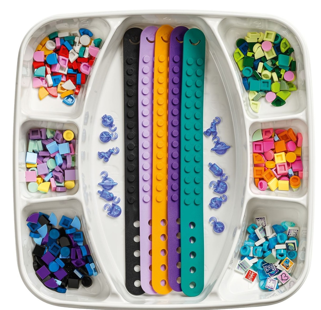 Ищете творческое групповое занятие для детей от 6 лет, увлекающихся искусством и дизайном? Подарите им этот мега-набор дизайнера браслетов Лего Дотс (41807). Поднос включает в себя 5 регулируемых браслетов разных цветов, множество цветных плиток, 12 специальных переливчатых подвесок и 20 случайных эксклюзивных графических плиток с различными значками, высказываниями, персонажами и узорами. Набор посвящен 5 различным увлечениям: животным, уличному стилю, природе, космическим чудесам и летним развлечениям. В комплект входит вдохновение, которое поможет поощрить творчество детей, а браслеты готовы к украшению прямо из подноса.