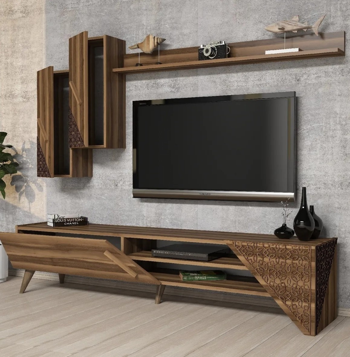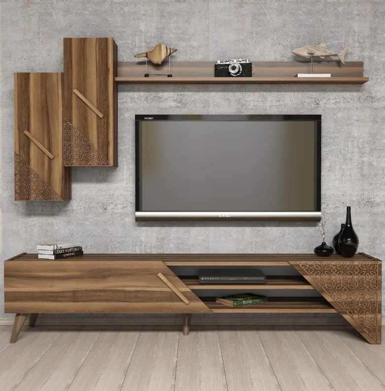 Ощутите идеальное сочетание стиля и функциональности с современным комплектом для гостиной. Изготовленный из древесных плит, покрытых меламином, этот набор создан для долговечности и стойкости к ежедневной эксплуатации. Толщина 18 мм обеспечивает прочность и устойчивость, а декоративная обработка CNC придаёт мебели утончённый вид.