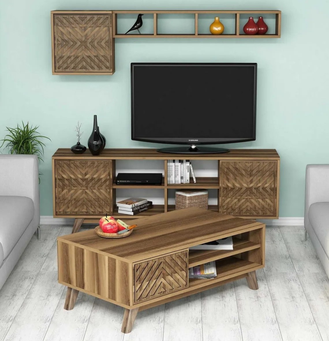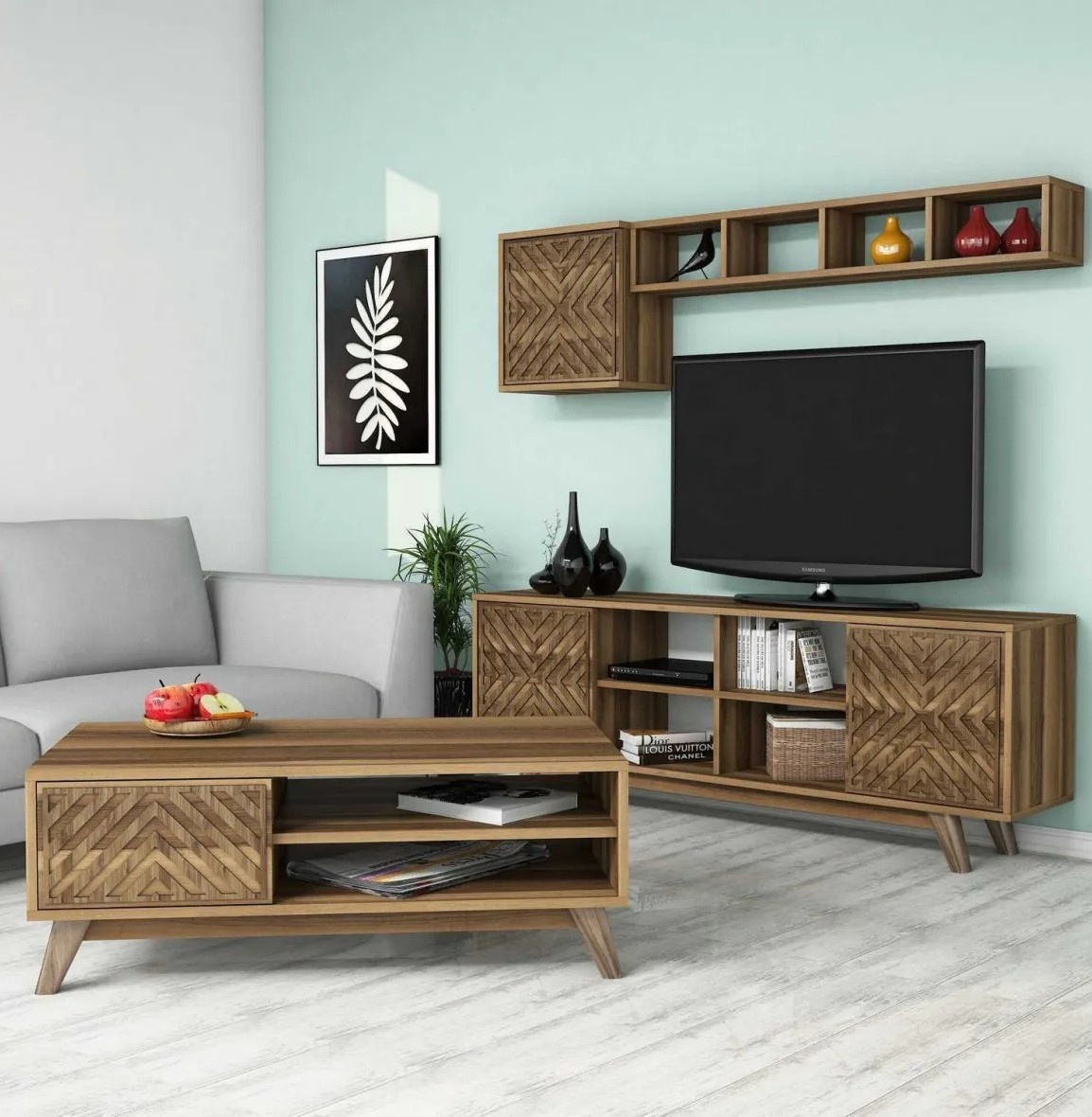 Набор включает тумбу для телевизора, настенную полку, шкаф и журнальный столик, предлагая достаточно места для хранения необходимых вещей. Многочисленные полки помогают поддерживать порядок и освобождать пространство от лишних предметов.