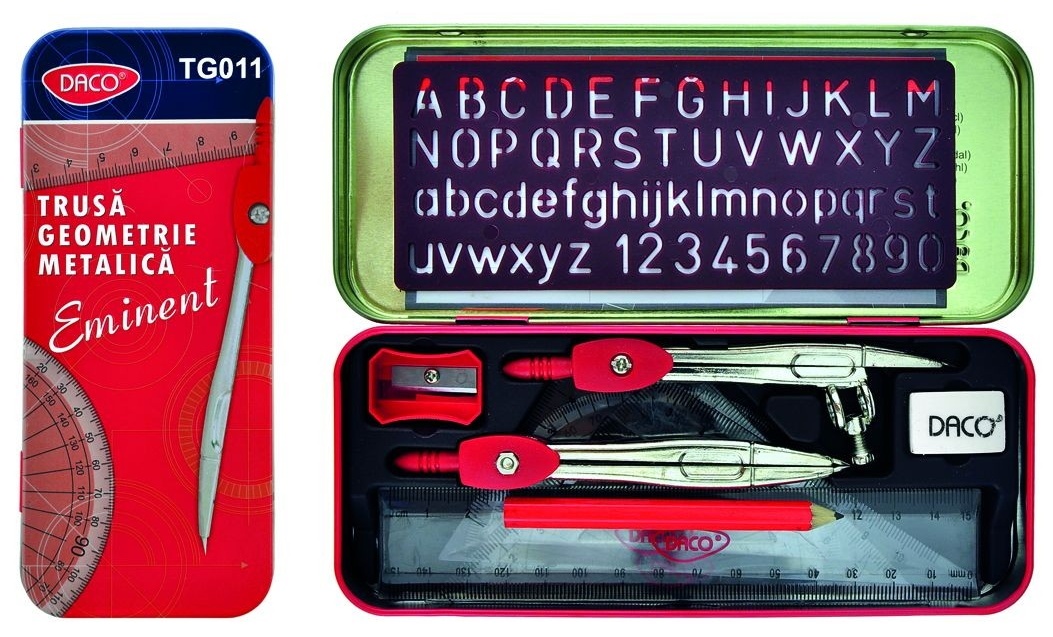 Набор геометрии Daco, полезный набор, содержащий 10 предметов: циркуль из металла, транспортир, линейку 15 см и два угольника из прозрачного пластика, карандаш, ластик, точилку и буквы-шаблоны / числа. Внутри коробки находится бабочка с математическими формулами с одной стороны и расписанием с другой. Детали упакованы в практичную металлическую коробку. Размеры коробки следующие: 177х75х18 мм.
