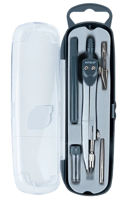 Kite K18-384-03 — набор незаменимых инструментов для черчения геометрических фигур. Состоит из металлического циркуля, металлической линейки, держателя для линейки, металлической иглы и пенала с запасным карандашом.