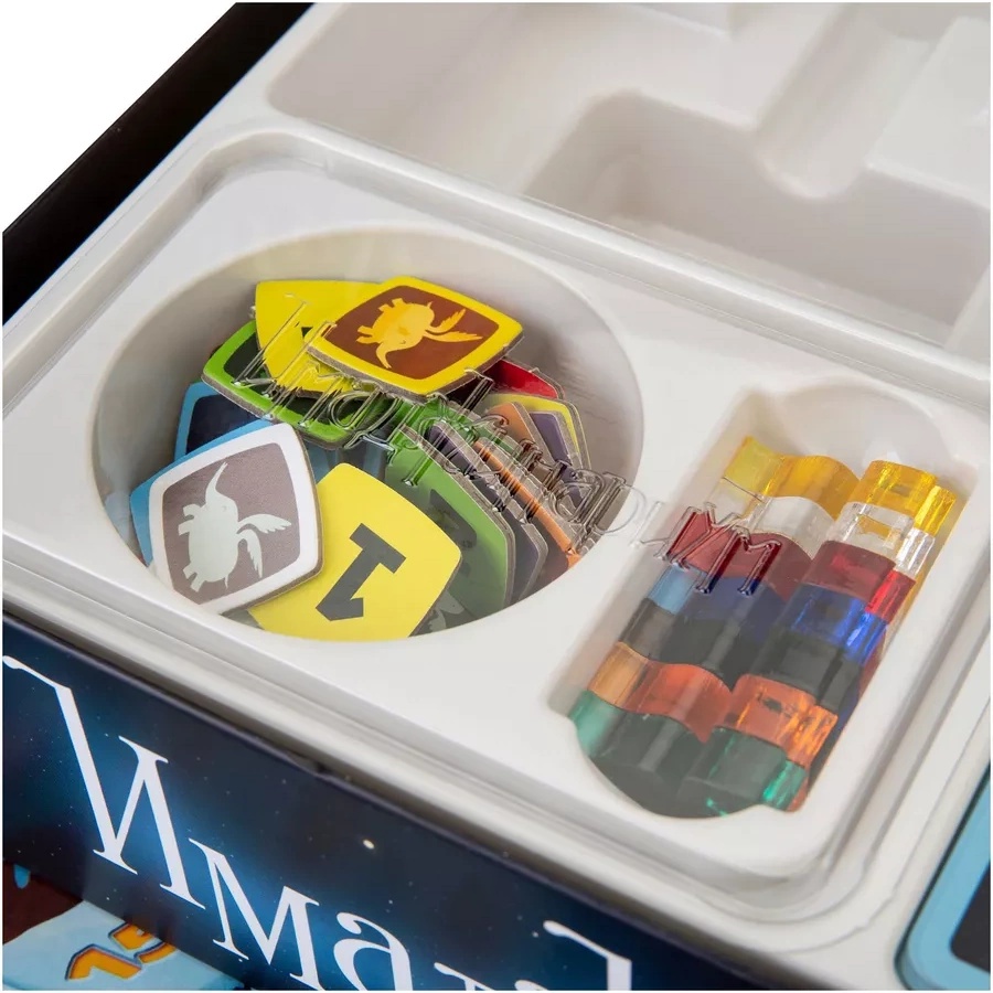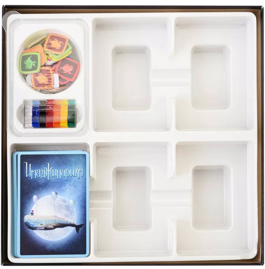 В обновленной версии «Имаджинариума» появился удобный пластиковый ложемент с кладовыми для колод и специальным закрывающимся отделением для фишек. Мы сделали поле съемным и вынесли на него подсказки по подсчету очков, чтобы сделать игру еще приятнее. Также в новой версии появились нумераторы — специальные жетоны, помогающие разложить карты по порядку и облегчающие голосование.Крылатые слоники, впрочем, остались прежними: яркими, веселыми и прозрачными, словно леденцы.