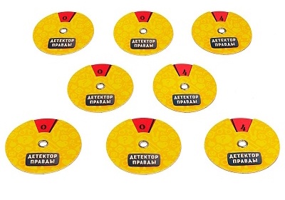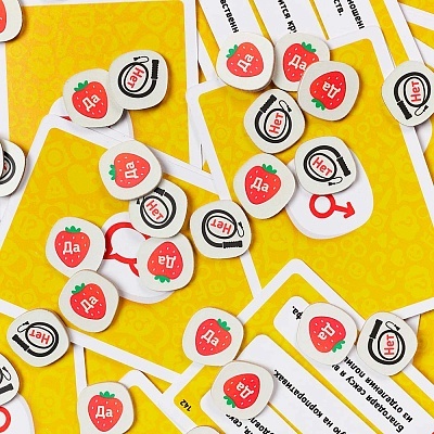 Комплектациякарты - 100 шт., счётчики - 8 шт., ширма - 8 шт., фишки игроков - 8 шт., жетоны "да" - 24 шт., жетоны "нет" - 24 шт., правила игры