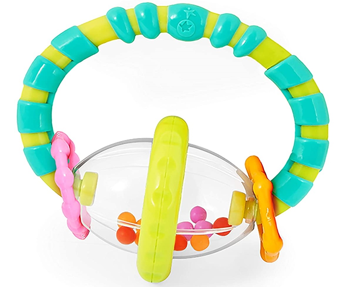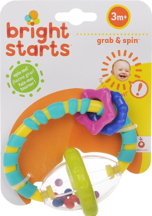 Разноцветная вращающая погремушка развивает мелкую моторику.