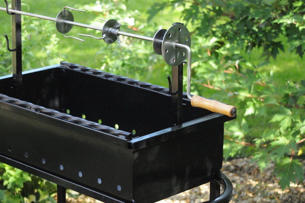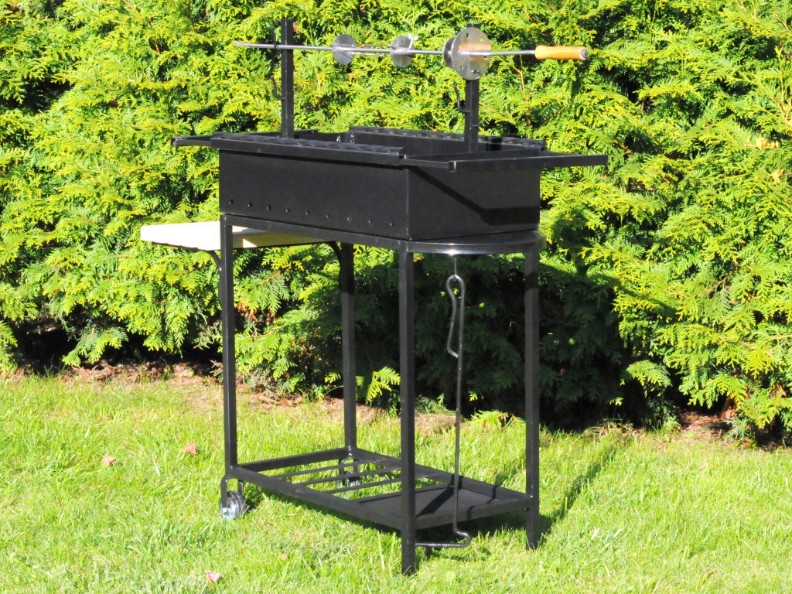 Мангал предназначен для максимально удобного приготовления продуктов на открытом огне. Мангал имеет сборно-разборную конструкцию для удобства транспортировки. Сборка мангала осуществляется без использования, каких либо инструментов. По периметру топки сделано ребро жесткости, чтобы ее не вело. Из вспомогательного оборудования имеется: вертел, полка для дров и угля, выдвижные полки для шампуров, кочерга. Вертел полностью изготовлен из нержавеющей стали.