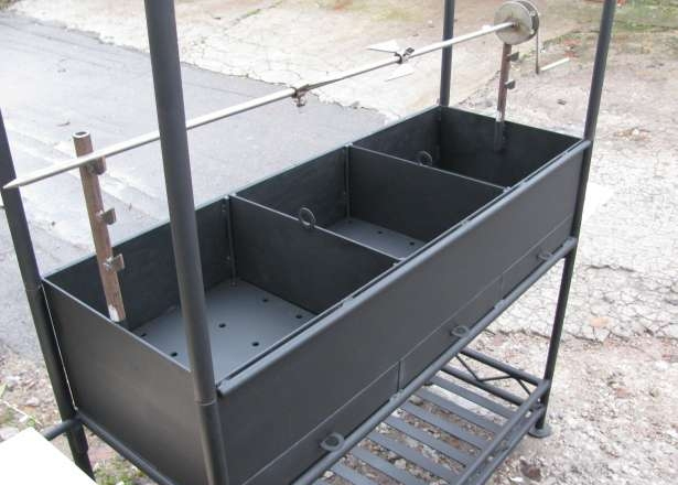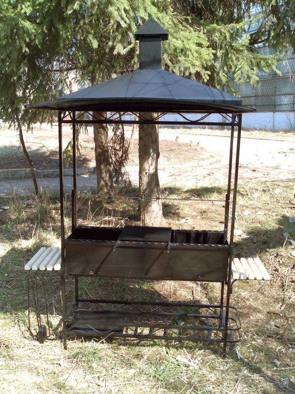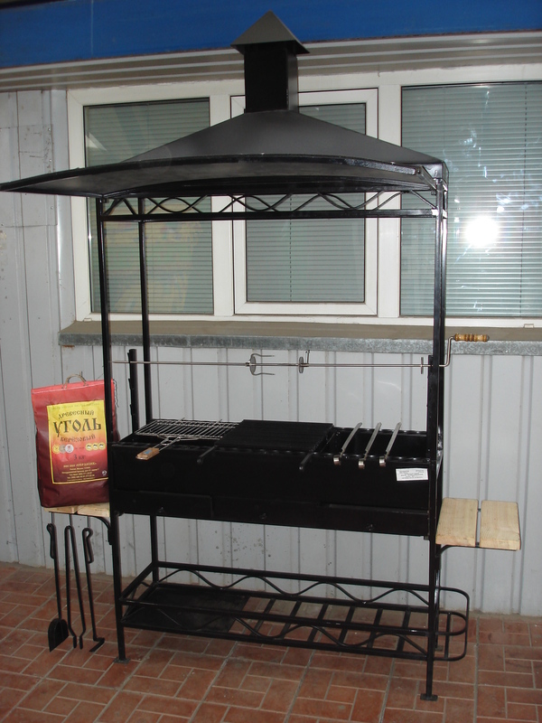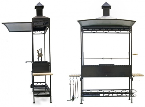 Мангал предназначен для максимально удобного приготовления и разогрева пищи на открытом огне, как для частного, так и для коммерческого использования, в кафе, барах и других местах общественного питания. Мангал имеет сборно-разборную конструкцию для удобства транспортировки. Сборка мангала осуществляется без использования, каких либо инструментов. Топка мангала изготовлена из стали 4 мм, и имеет 2 съемные перегородки для регулировки используемого объема мангала. Топка имеет три заслонки для регулировки поддува (силы горения углей). Из вспомогательного оборудования имеется: защитный козырек, решетка для жарки, вертел, 2 съемные деревянные полки, полка для дров и угля, полка для бутылок, кочерга, щипцы, совок. Вертел полностью изготовлен из нержавеющей стали. Решетка для жарки изготовлена из пищевой нержавеющей стали;