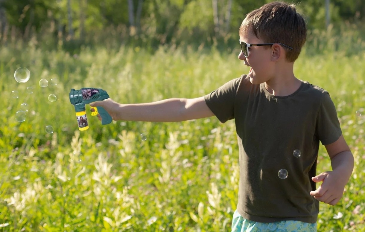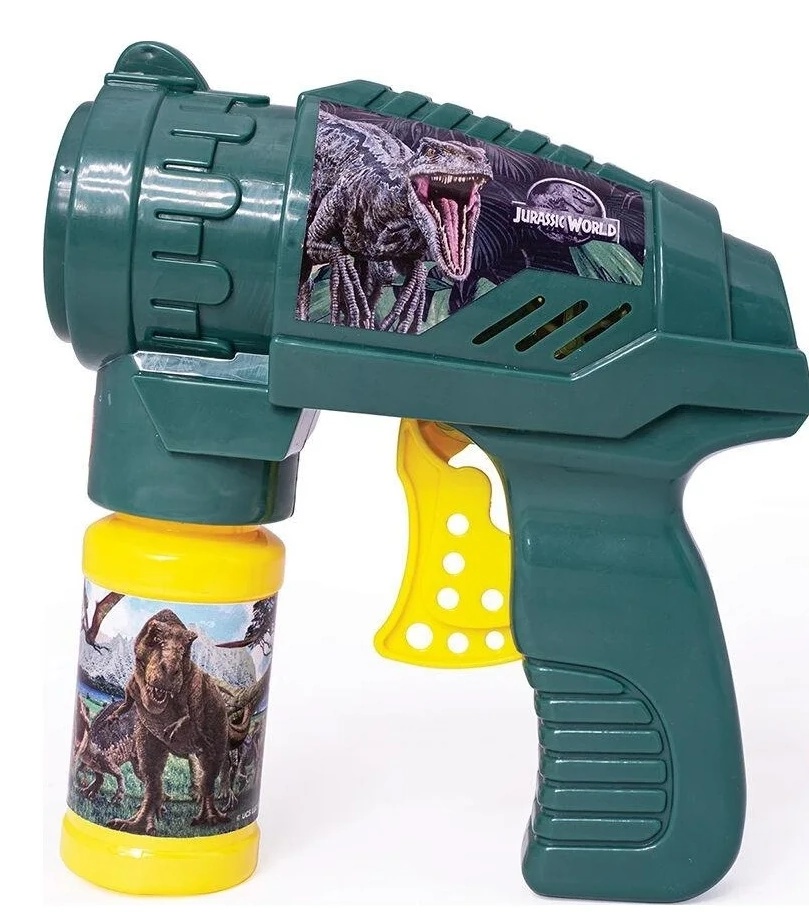 Нагнетатель пузырей Jurassic World для бесконечных пузырей! Поместите бутылку с пузырьками в пистолет для пузырей, нажмите на спусковой крючок и сделайте тысячи пузырей!