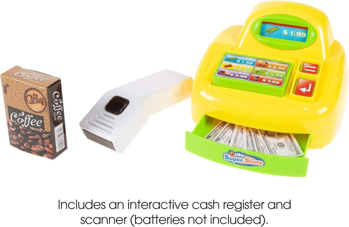 Касса и сканер работают как настоящие - со звуковыми эффектами.