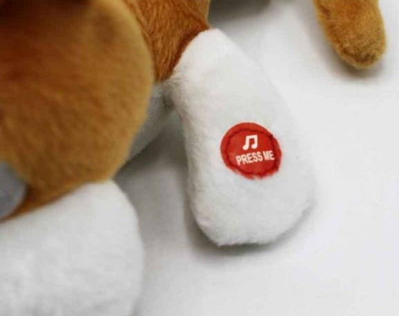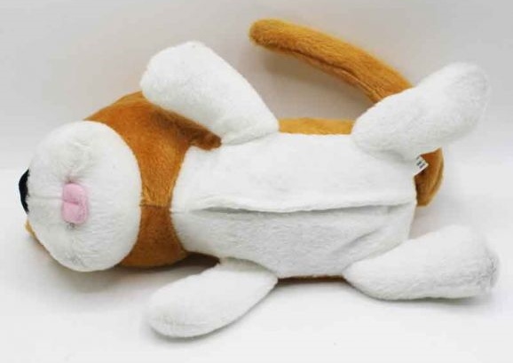 Собака коричнево-белого цвета и с удовольствием катается по полу, когда дети играют с ней. Игрушка также имеет забавные звуковые функции в виде смеха для еще более веселых игр.