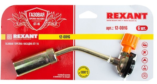 Газовая горелка-насадка REXANT GT-16 — это самая недорогая горелка с широким соплом. Отлично подойдет для экономичных пользователей, торговых сетей. Рекомендуется для работы с термоусаживаемыми трубками, перчатками, муфтами; для плавления и сварки изделий из пластиков и стекла; удаления краски; обработки поверхностей на производстве и в лабораторных условиях; для разморозки замков, водопроводных труб, продуктов; для копчения продуктов или карамелизации десертов; для работ в саду и огороде, для быстрого и экологичного поджига дров, угля.