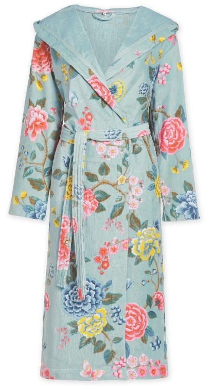 Этот нежно-голубой халат украшен рисунком «Добрый вечер» с яркими цветами. Халат имеет боковые карманы и капюшон. Халат следует постирать перед использованием в соответствии с этикеткой по уходу.
