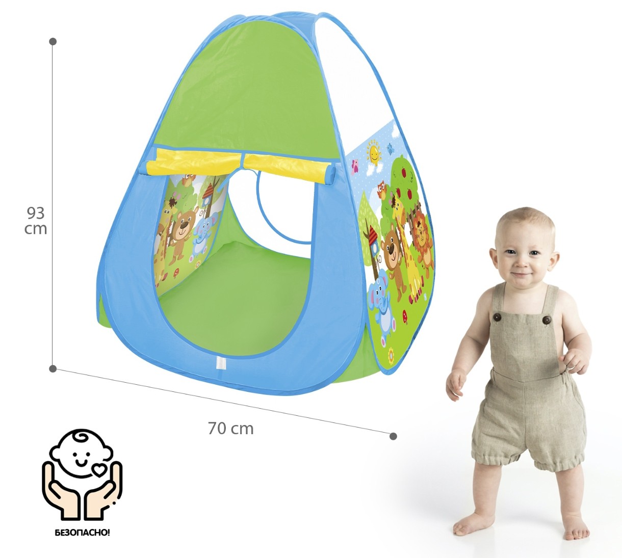 Яркая, компактная и в то же время вместительная палатка. Для взрослого это просто палатка, а для ребенка личное пространство, место, где он будет играть часами, место, где он будет прятать и складывать свои игрушки. Палатка очень легкая, раскладывается за считанные секунды, а также легко складывается обратно в специальный мешок.