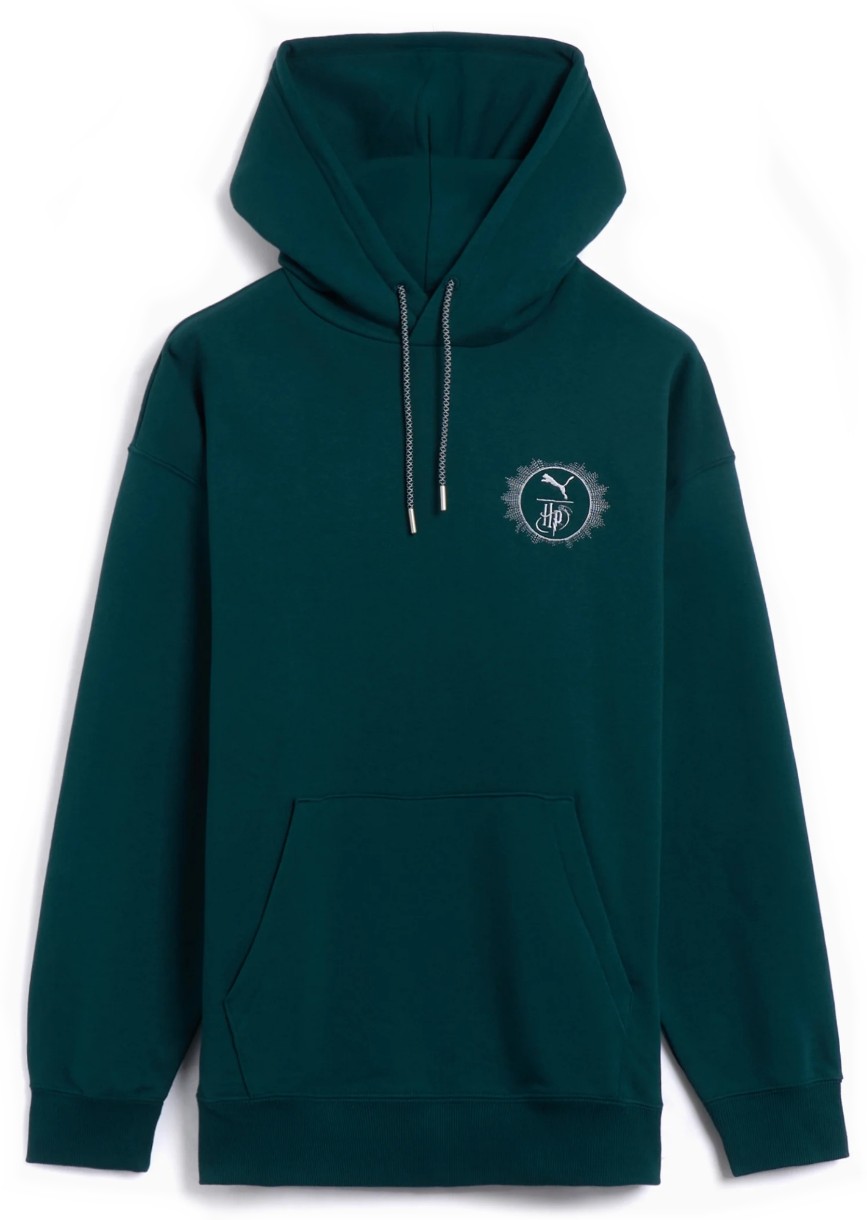 Толстовка выполнена из мягкой ткани French Terry, которая дарит комфорт и сохраняет удобную посадку. Свободный крой и спущенные плечи подчёркивают расслабленный характер модели, а вместительный карман-кенгуру делает её ещё более практичной. Капюшон с утягивающими шнурками и эластичные манжеты в рубчик помогают защититься от прохлады. Главные акценты – скрытая вышивка Golden Snitch™, вышитый брендинг PUMA x HARRY POTTER на груди и выразительный графический принт на спине, которые превращают худи в особый элемент гардероба.