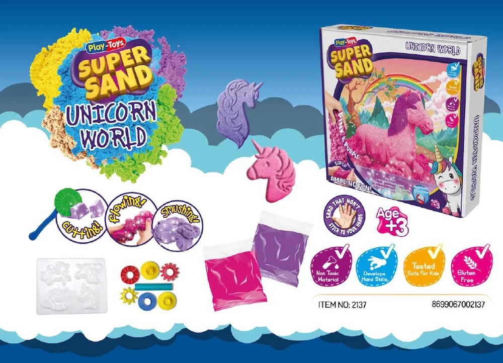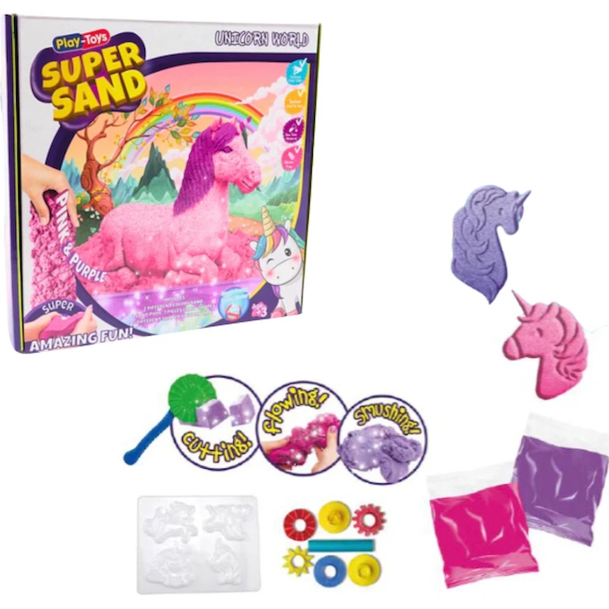 В набор входят розовый и фиолетовый песок, а также формочки и инструменты с тематикой единорогов, позволяющие создавать собственные сказочные фигурки и сцены. Песок легко принимает форму и дарит приятные сенсорные ощущения во время игры.
