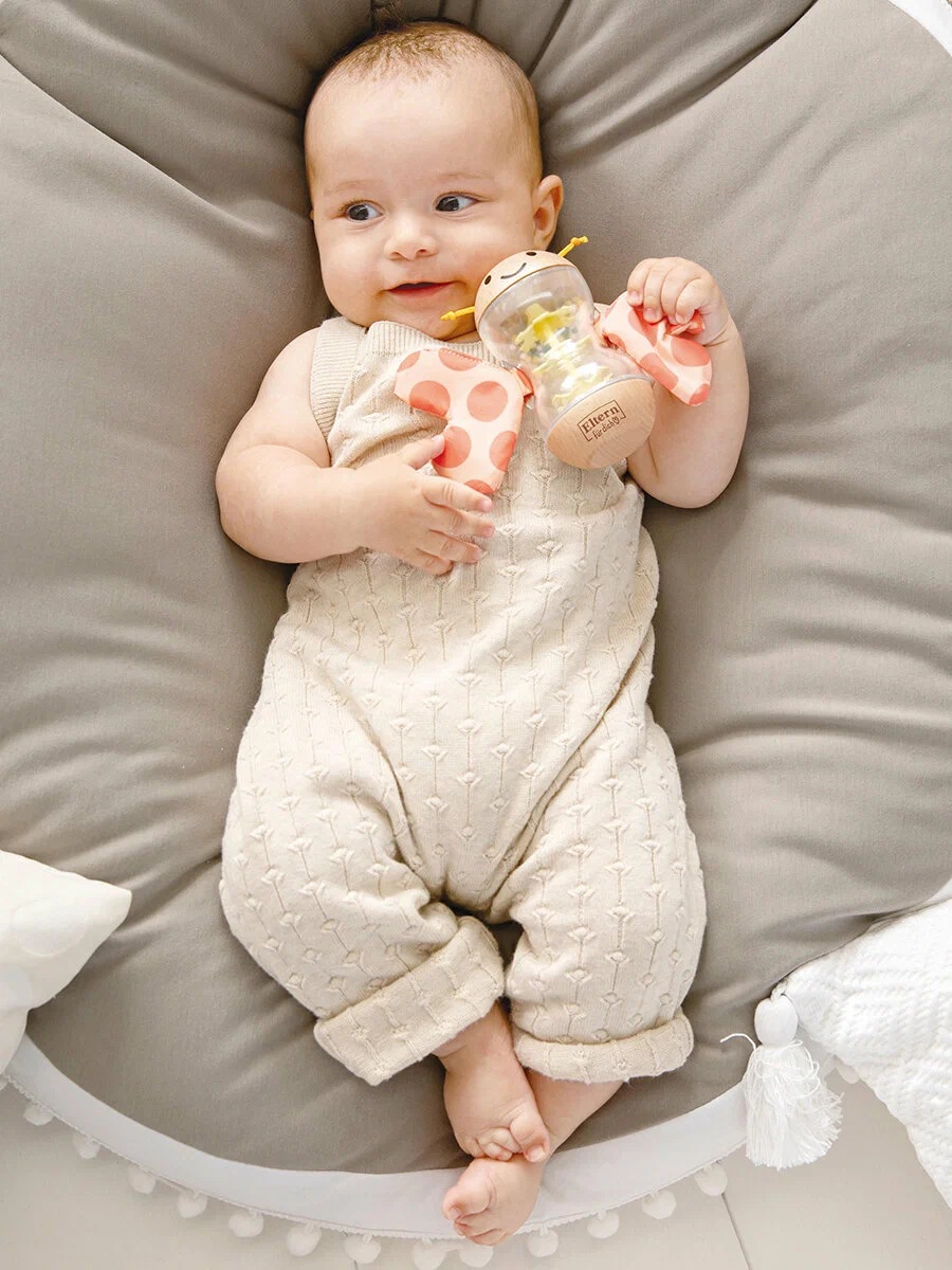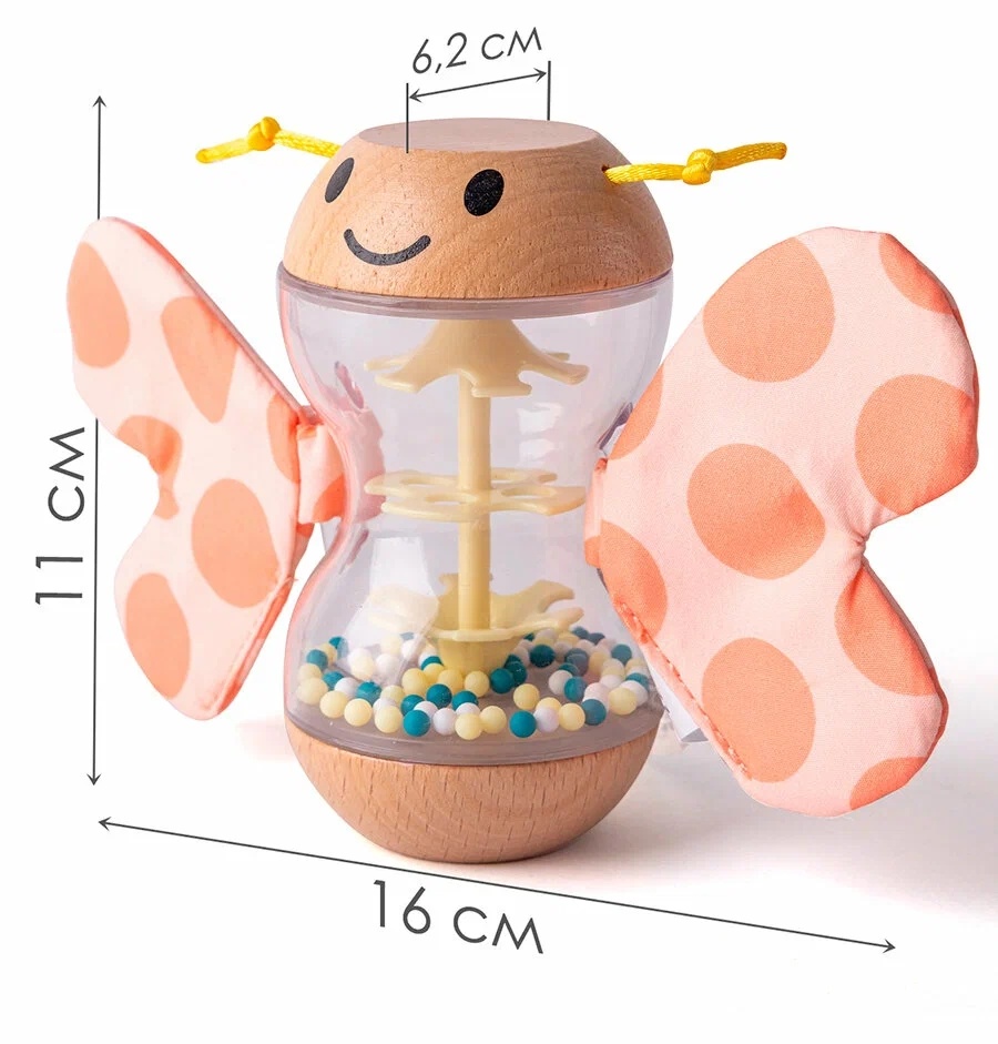 Погремушка Бисерный дождь – изготовлена в виде бабочки. Съемные крылья для легкой стирки. Переверните игрушку и польется яркий бисерный дождик с успокаивающими звуками. Насыщенные звуковые эффекты, такие как переливы капель дождя и шуршание крыльев. Форма игрушки специально разработана для детских ручек, поэтому малышу будет легко её держать. Использовать можно с самого рождения в виде погремушки.