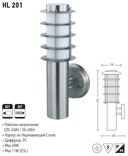 Парковый светильник, максимальная мощность лампы 60Вт. Корпус из нержавеющей стали. Защита ІР 44. Размеры: 120×350 мм.
