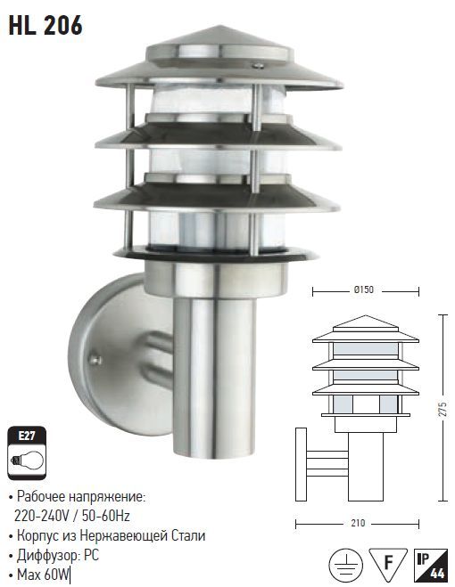 Парковый светильник, максимальная мощность лампы 60Вт. Корпус из нержавеющей стали. Защита ІР 44. Размеры: 150×275 мм.