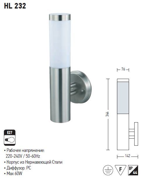 Парковый светильник, максимальная мощность лампы 60Вт. Корпус из нержавеющей стали. Защита ІР 44. Размеры: 76×344 мм.