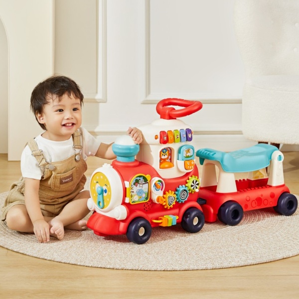 4 способа игры: каталка, ходунки, вагончик для перевозки игрушек и игровое сиденье. 9 обучающих игр: разнообразные игры для развития ребенка. Разнообразная музыка и звуковые эффекты поезда: увлекательные звуки и мелодии. Отсек для хранения: удобное место для хранения игрушек. Панель с блоками: игровая панель для развития моторики и когнитивных навыков.