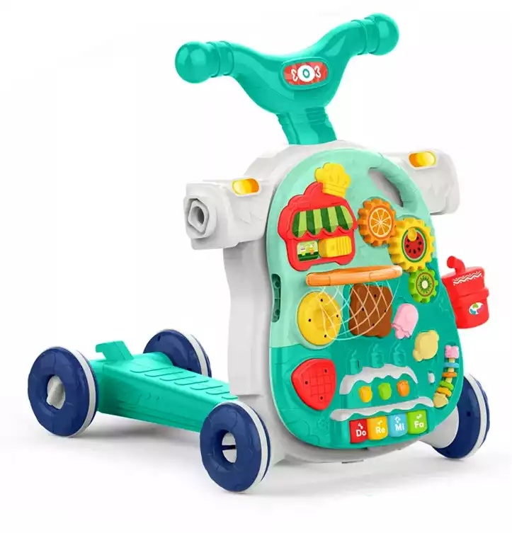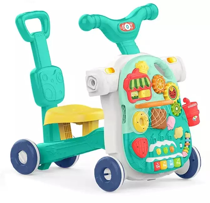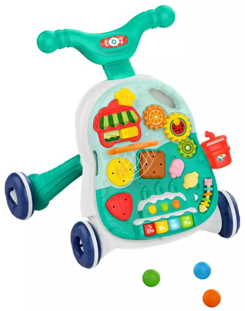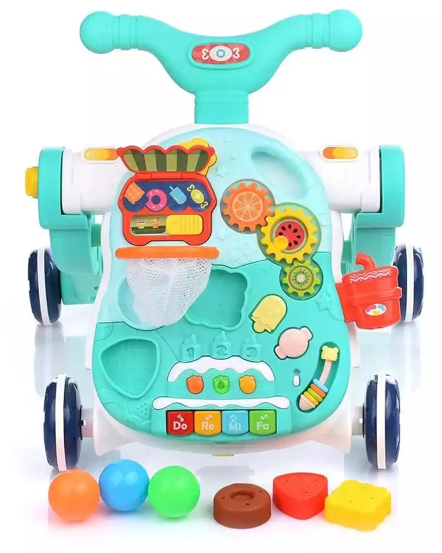 Развивающий игровой центр совмещает в себе 4 функции: ходунки,самокат, беговел, игровую панель.