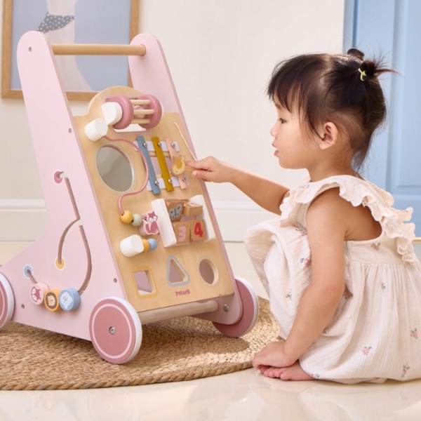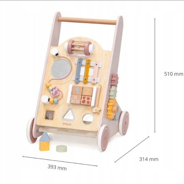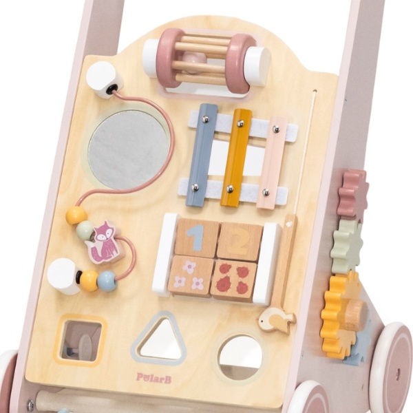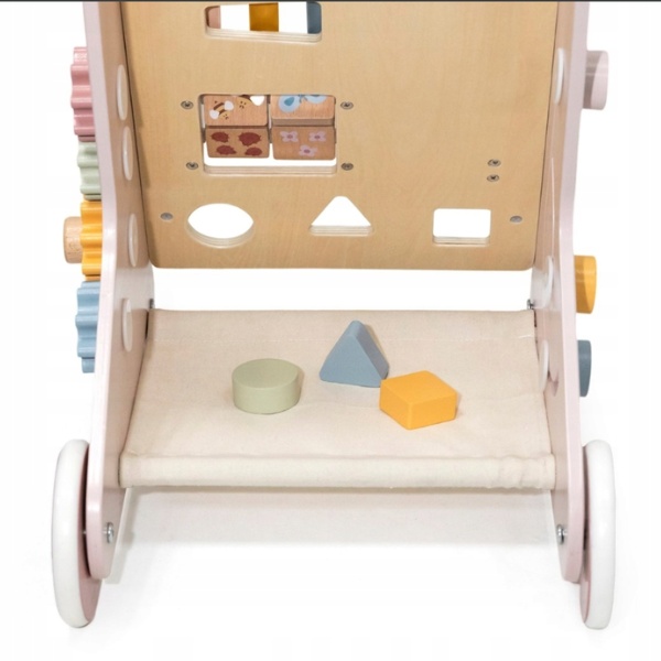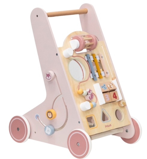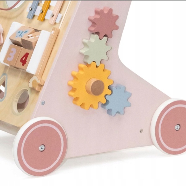 Деревянные ходунки-каталка с игровой панелью помогут малышу совершенствовать навыки ходьбы. Передняя панель представляет собой игровой центр с приспособлениями для развития моторики рук, координации рук и глаз. На панели размещены часы с подвижными стрелками, разноцветные шестерни, счеты, вращающийся цилиндр, проволочный лабиринт и волнистый трек.