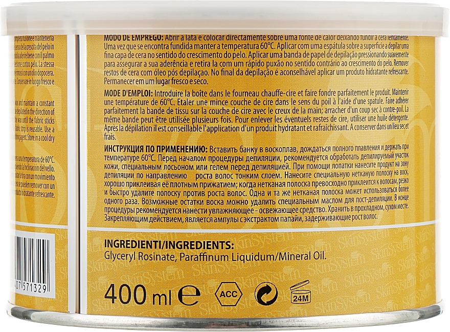 Воск SkinSystem в банке — теплый воск, который может быть использован для всех типов кожи. Не имеет запаха, ложится тонким слоем, неплотный, не липкий. Подходит для удаления грубых, жестких волос. В состав натурального воска входят медовые экстракты. Они бережно действуют на кожу, защищают ее от раздражений. Температура нагрева (40-50 градусов) дает возможность разогревать воск в домашних условиях: в микроволновой печи или на водяной бане. Данный воск и другие его виды состоят только из натуральных компонентов. Способ применения: теплые воски наносятся на кожу шпателем, а затем удаляются при помощи специальных полосок. Преимущества — в быстроте и простоте проведения процедуры, а также в долговременности результата депиляции.