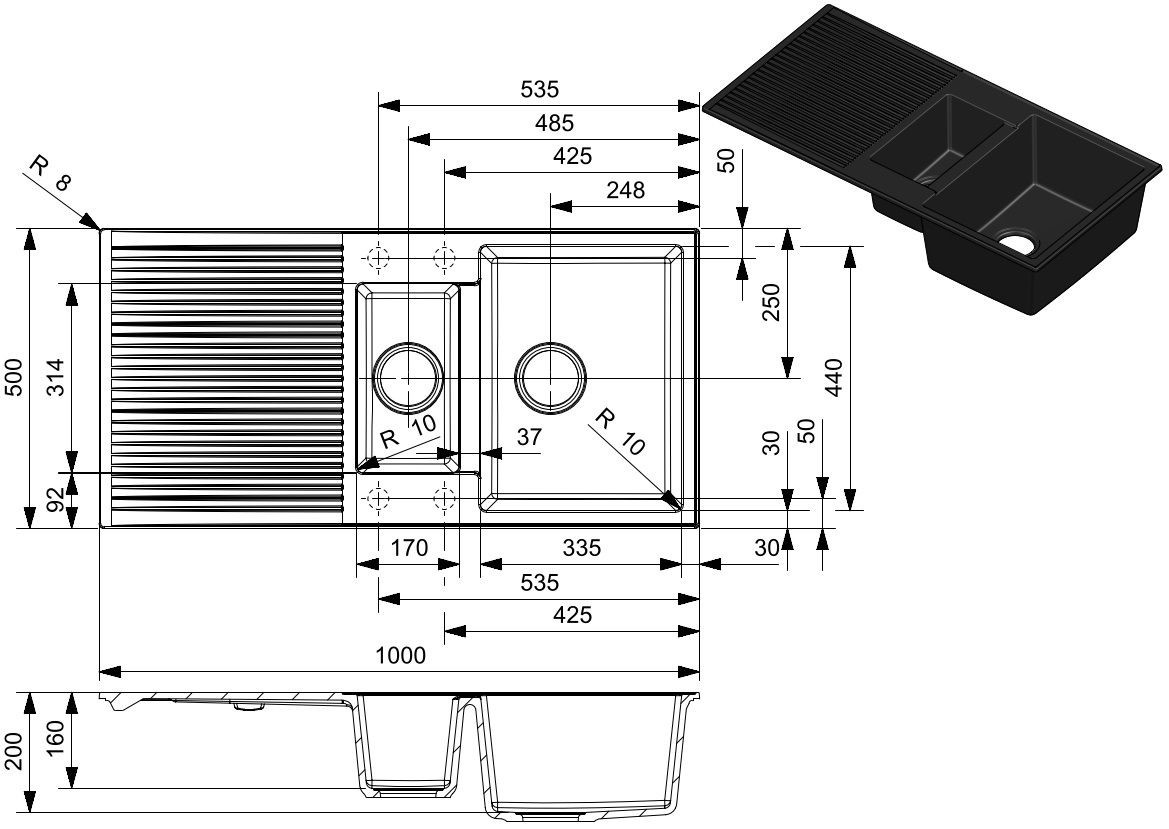 Размер мойки1000х500 мм