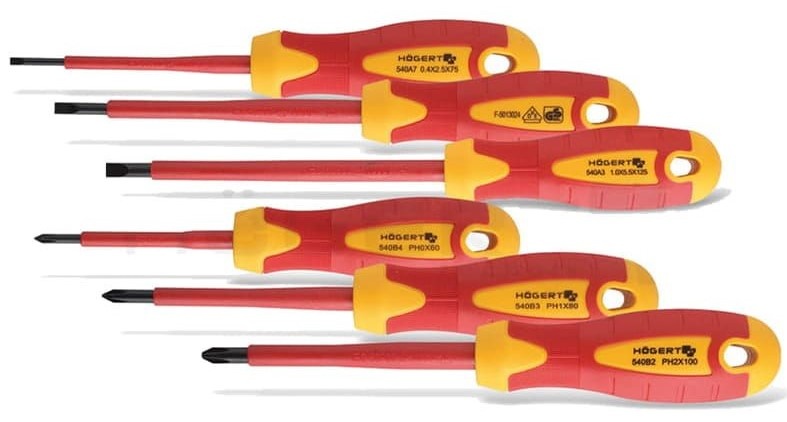 Набор из 6 отверток, сертифицированных для работы на электрических проводах под напряжением до 1000V.