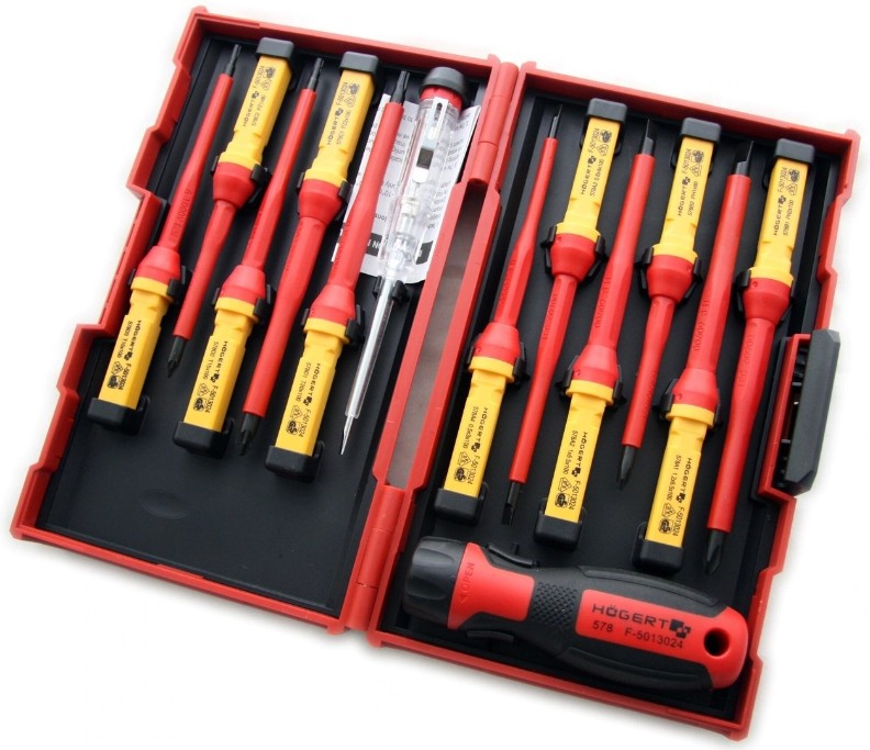 Набор изолированных отверток на 1000 В со сменной ручкой и тестером напряжения, предназначенный для определения напряжения в розетках. Набор поставляется в пластиковом футляре.