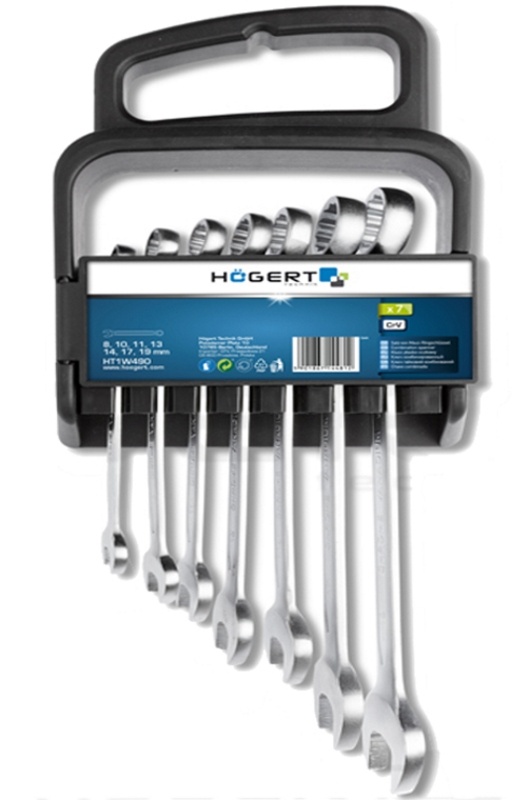 Набор ключей комбинированных Hogert HT1W490 состоит из 7 ключей. Все они изготавливаются из высокопрочной хром-ванадиевой стали, благодаря чему обладают повышенной прочностью и надежной антикоррозийной защитой. Удобная упаковка с ручкой для переноски и возможностью подвешивания.