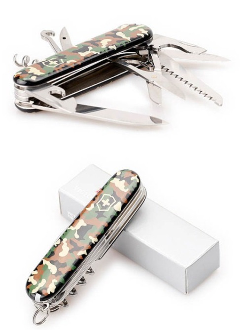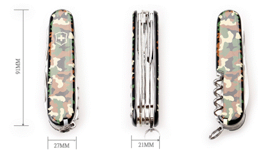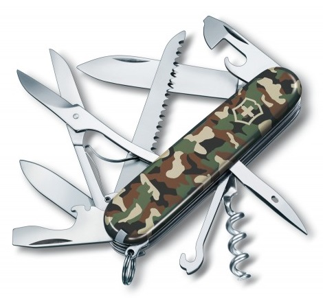 Складной швейцарский нож Victorinox Huntsman с камуфляжной рукоятью содержит 12 элементов, выполняющих 16 функций Набор функций – 16: - Большой клинок - Малый клинок - Открывалка для консервных банок / плоская отвертка - Открывалка для бутылок / отвертка / паз для снятия изоляции - Ножницы - Пила по дереву - Шило / кернер - Штопор - Универсальный крючок - Пинцет - Зубочистка - Кольцо для ключей