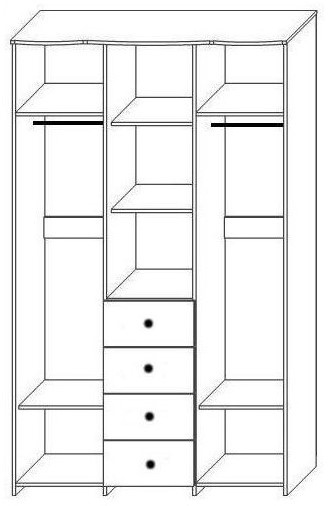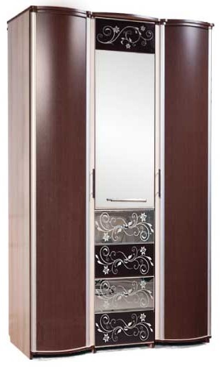 Петли без доводчиков, ящики на шариковых направляющих. Задняя стенка изготовлена из ХДФ. К средней двери крепится зеркало с фацетом 15мм. и стекло с шелкотрафаретным рисунком. К накладкам ящиков также крепятся стёкла и зеркала с шелкотрафаретным рисунком. Вставки крайних дверей изготовлены из плиты ХДФ фасадной и имеют радиусную форму. В средней части шкафа за дверью две съёмные полки, а в левой и правой части установлены штанга для одежды. При желании петли с доводчиками можно приобрести дополнительно и самостоятельно установить их.