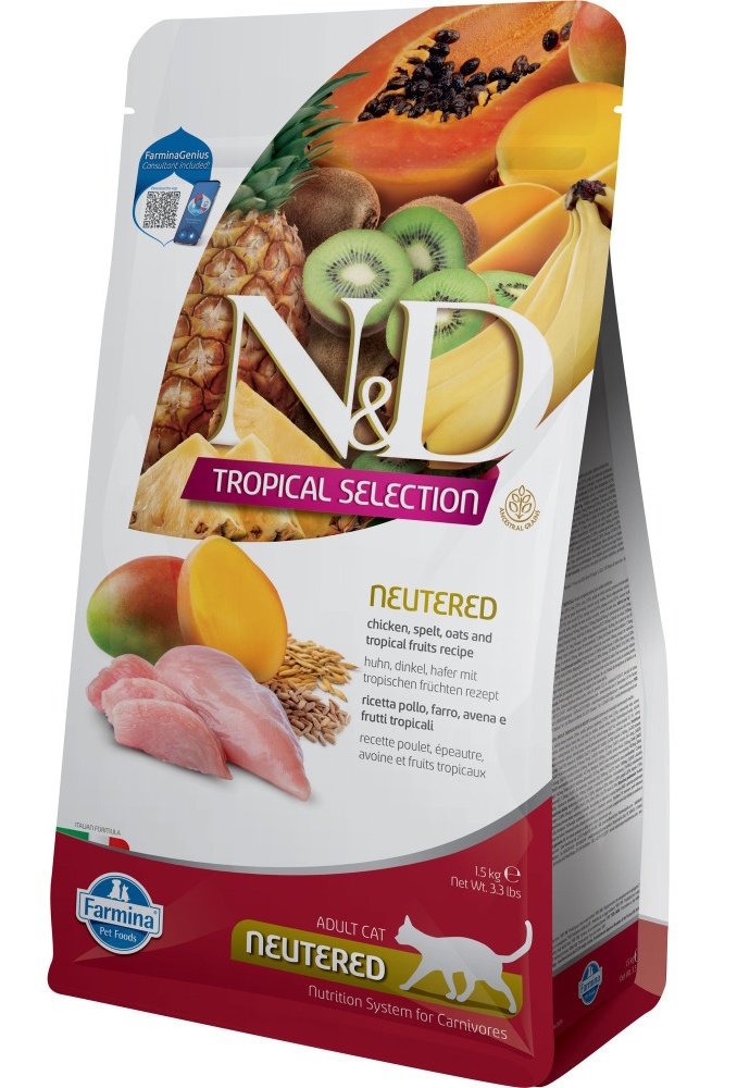 N&D Tropical selection - это новая линия кормов, разработанная Farmina, изготовленная из зерновых с низким гликемическим индексом (полбой и овсом) и различных тропических фруктов для хорошего самочувствия кошек и собак.