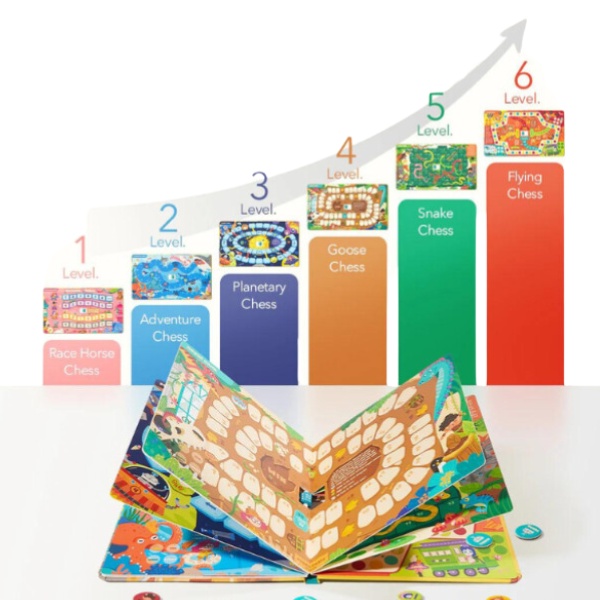 Дизайн в стиле книги позволяет переворачивать страницы для смены игровых полей, а кубики и фигуры аккуратно хранятся. Игры имеют различный уровень сложности — от простого до сложного, что помогает детям развивать навыки соблюдения правил, логического мышления и быстрой реакции. Каждая игра дополнена увлекательными историями, создавая привлекательную игровую атмосферу для всех возрастов. Магнитные элементы имеют мягкую магнитную основу для надежного закрепления в книге, предотвращая потерю деталей. Водоотталкивающая игровая поверхность легко чистится, обеспечивая долговечность. Простое руководство позволяет быстро обучиться и начать играть всем желающим.