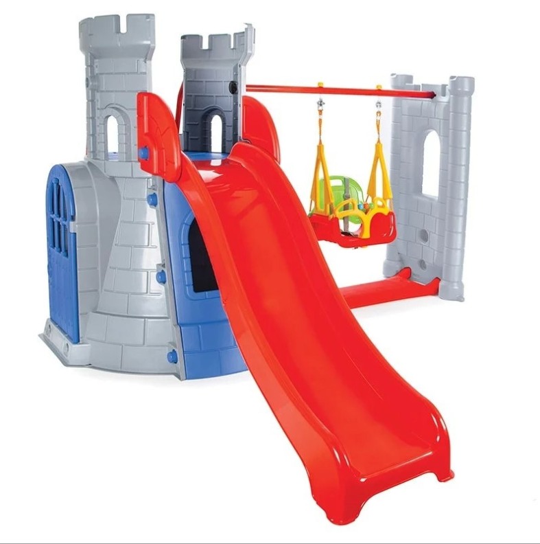 Игровой комплекс Замок с горкой и качелью (07-961) предназначен для установки на детские площадки как открытого, так и закрытого типа, в том числе в жилых помещениях. Рекомендуется для детей от 2 до 10 лет, при этом максимальный вес ребенка может достигать 50 кг. Игровой комплекс состоит из прочного основания в виде сторожевой башки с дверями, лестницы с ручкам, ската горки и дополнительной стойки с одиночной качелью на стальной штанге с гибким подвесом. Скат оснащен бортами безопасности и не даст Вашему ребенку случайно выпасть с большой высоты. В комплекте поставляется сиденье для качели Samba (06-129 или 16-199), однако, Вы можете докупить и установить любой вид сиденья бренда Pilsan. Высота комплекса в собранном состоянии достигает 1 м 46 см, что не требует высоких потолков в случае его установки в жилом помещении, однако ширина в собранном состоянии превышает 2 метра.