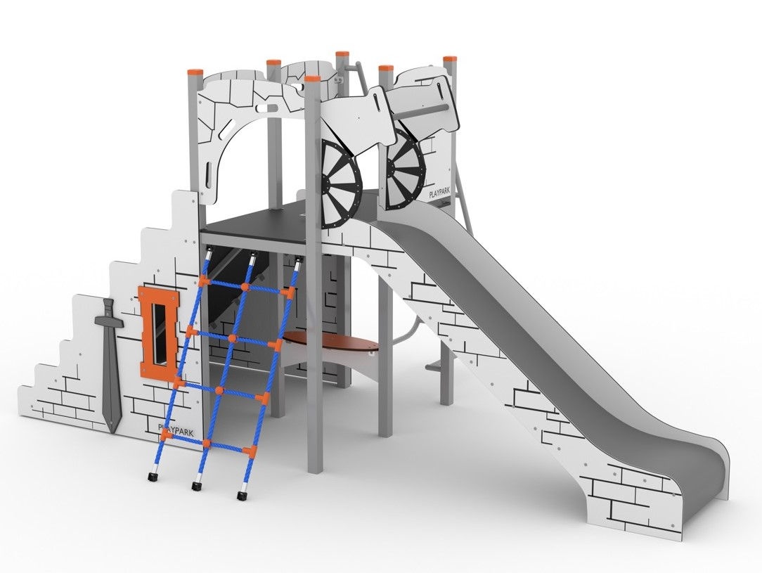 Комплектация: Башня, Горка широкая (H=1,2м), Скамья, Скалодром широкий , Лаз из армированного каната, Лестница и Перекладины для лазанья, декоративные элементы: "Окошко", "Пушки боевые","Мечи рыцарские".
