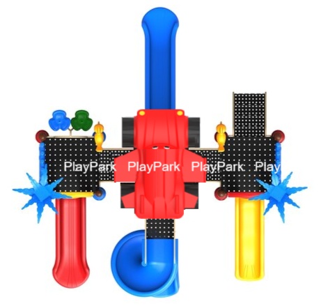 Комплектация: Лестница с поручнями (большая), две Лестницы с поручнями (малая), Башня с крышей "ТАЧКА", две Башни без крыши, Горка прямая (Н=1,5м), две Горки прямые (Н=1м), Горка винтовая (Н=1,5м), Балкон, лестница для подъема "Ёлочка", комплекс украшен декоративными яркими элементами.