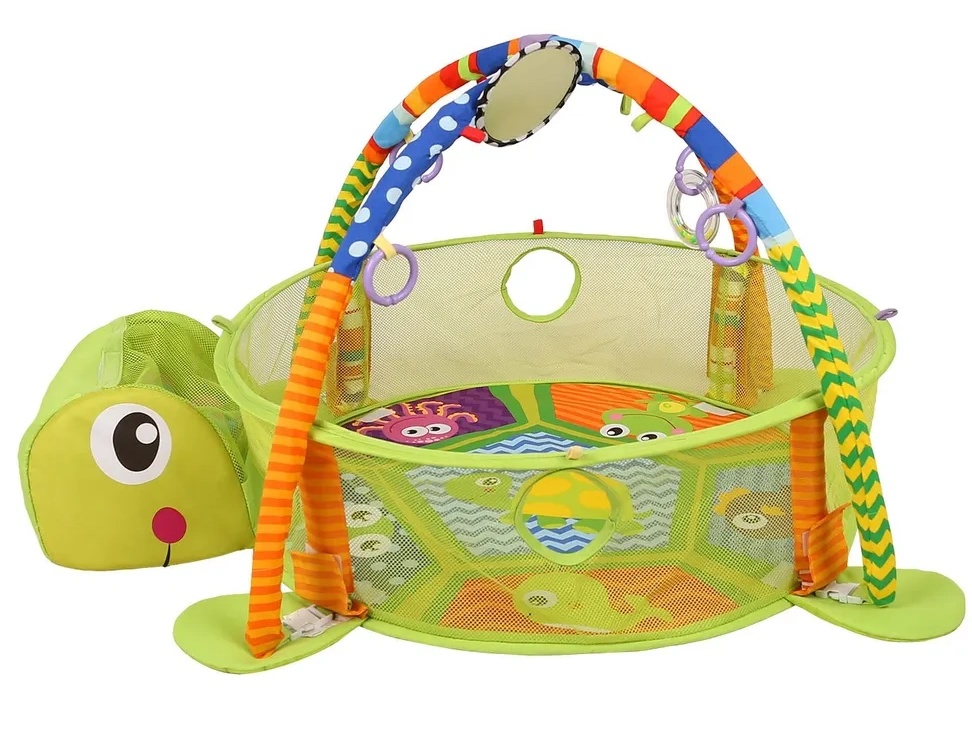 Шарики для сухого бассейна, оптимального размера и ярких цветов, можно хранить в сумке голове Черепахи. Подвесные игрушки снимаются, ими можно играть в любом возрасте, взять с собой на прогулку, повесить на кроватку или коляску.