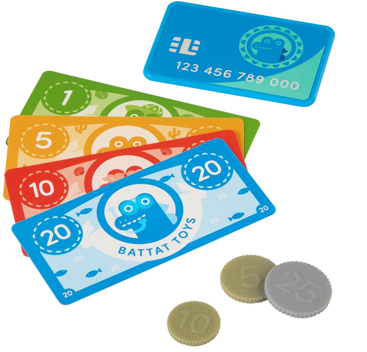 В комплекте: 1 кассовый аппарат, 1 кредитная карта, 12 монет, 16 купюр, 1 корзина для покупок и 4 игрушечных овоща