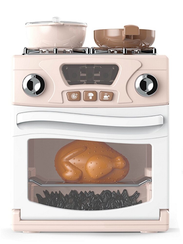 Реалистичный дизайн, хромированные детали, световые индикаторы и подсветка духовки, кнопка включения/выключения с музыкальным сопровождением, 2 кнопки- 2 режима готовки со звуковыми эффектами, 2 поворотные ручки с разными звуками приготовления блюд. Дверца духовки открывается, решётка из духовки вынимается. Такой функционал не оставит равнодушной ни одну девочку.