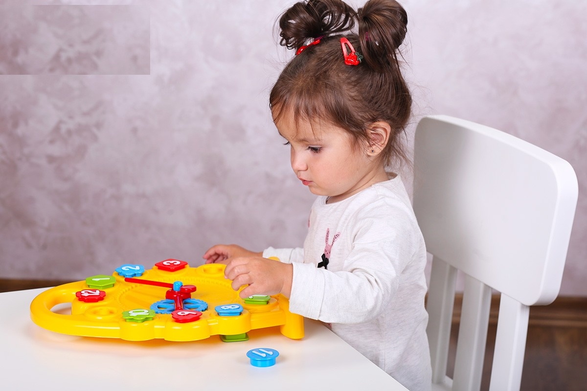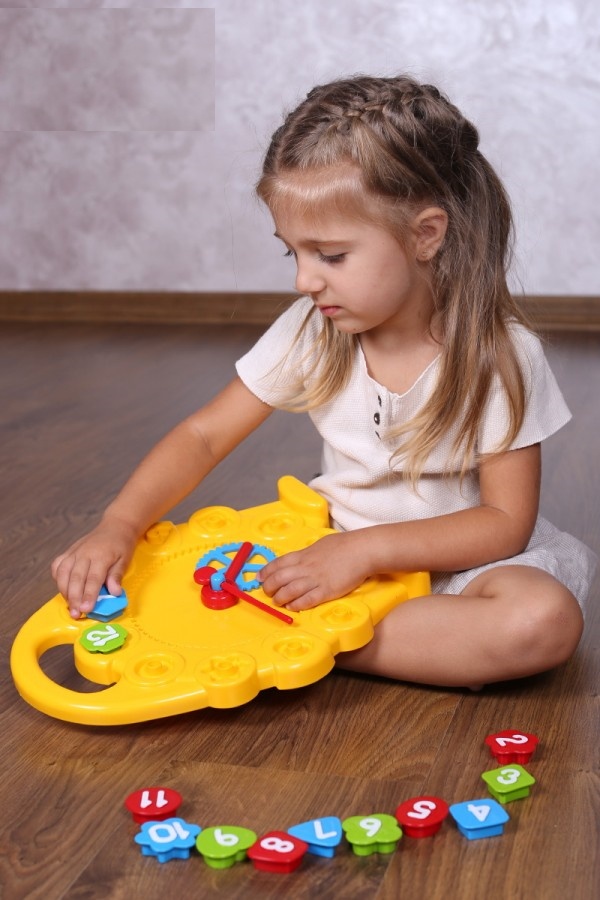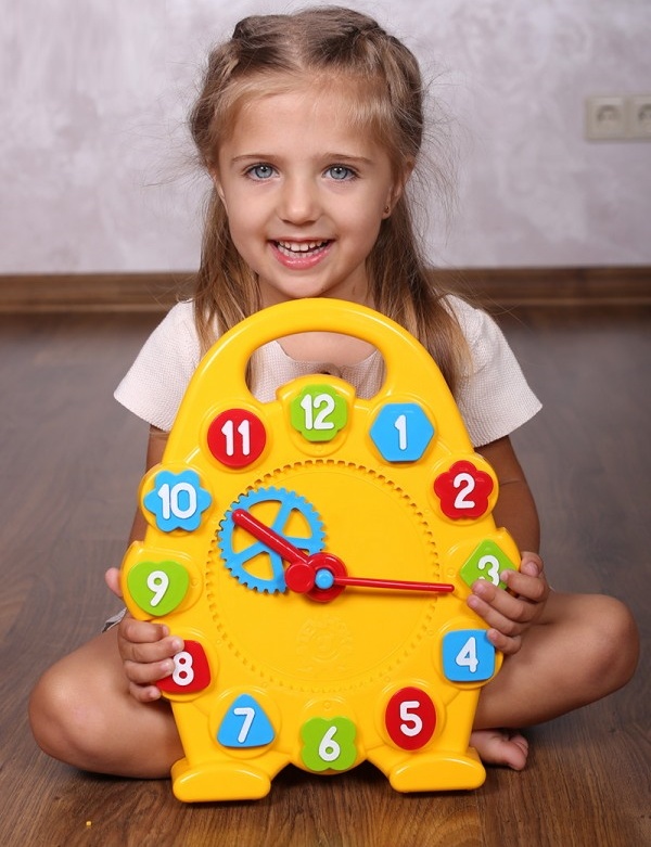 Часы помогут малышу научиться определять время. На циферблате расположены геометрические фигурки с цифрами, которые вынимаются.