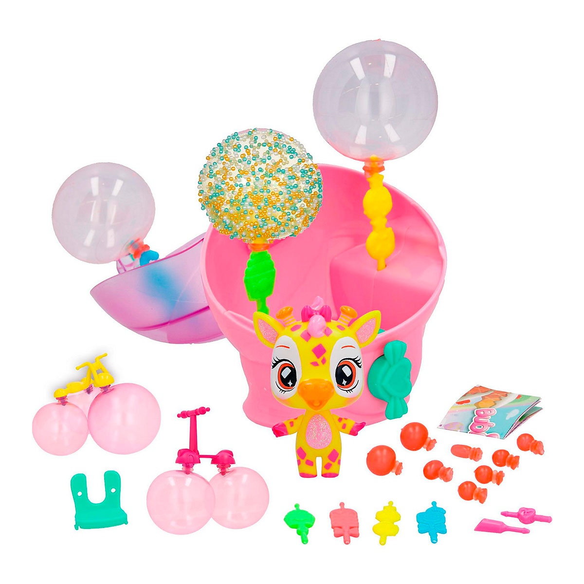 Он включает в себя различные аксессуары: 8 bubi-goos, 1 средство для создания пузырей, 2 персонализированных предмета и 3 обычные палочки для украшения капсулы пузырьками.