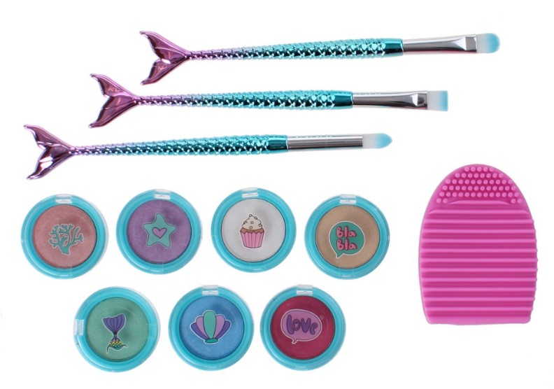 Набор содержит 7 теней для век, 3 разные кисти в форме хвоста и спонж.