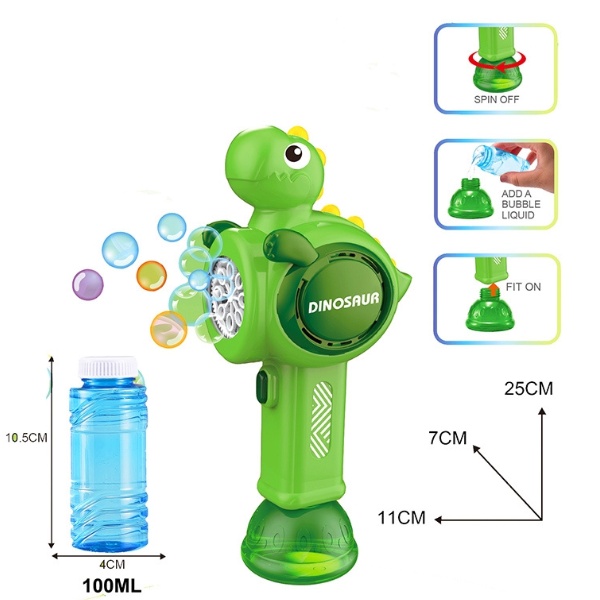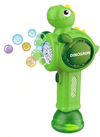Машинка для пускания мыльных пузырей “Динозавр” работает с помощью 4 батареек типа АА, так же включает баночку с раствором для мыльных пузырей, объемом 100 мл.