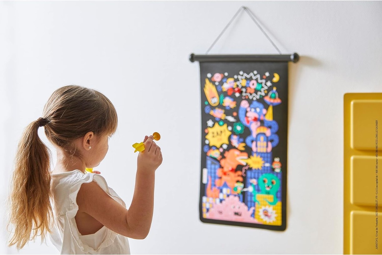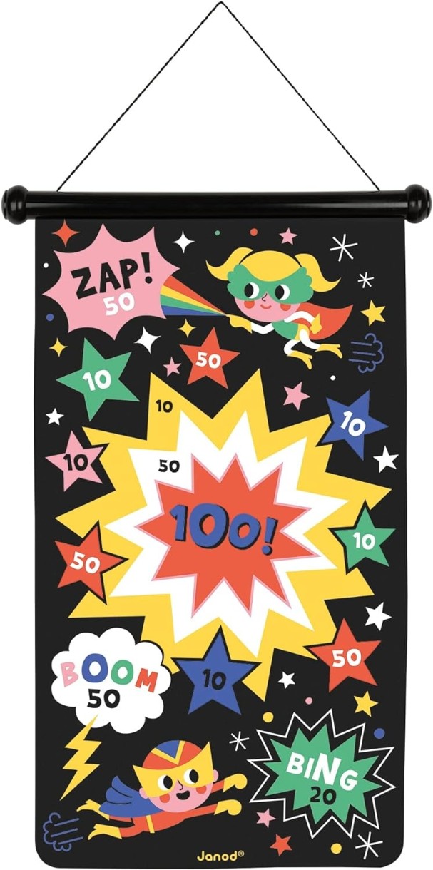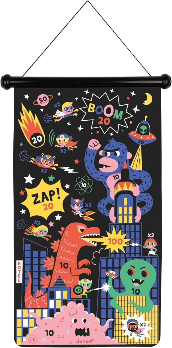 Станьте супергероем дартс с этой магнитной подвесной игрой для детей от 4 лет и старше! Научитесь целиться в безопасной среде благодаря этим магнитным дротикам, которые словно по волшебству прилипают к целям этой игры для вечеринок! Их плоский кончик позволяет без риска играть даже с самыми маленькими. Годзилла, Кинг-Конг и многие другие объединились в ряды, чтобы уничтожить все на свете! Чтобы нокаутировать этих плохих парней, понадобится меткость супергероя и несколько умелых ударов, вооружённых любимыми дротиками! Дети могут развлекаться по обе стороны игры и переходить от одной сцены к другой по настроению. У противников будет по 3 дротика (3 красных и 3 желтых), чтобы они попытались поразить области с более высокими номерами. Побеждает игрок, набравший наибольшее количество очков! Используйте веревку, чтобы повесить мишень на стену. Эта игра на ловкость идеально подходит для развития ловкости и концентрации детей. Он идеально подойдет для семейного отдыха или развлечения малышей на вечеринке по случаю дня рождения. После того как игра выиграна (или проиграна), мишень и дротики хранятся в закрытом ящике, чтобы ничего не потерялось.