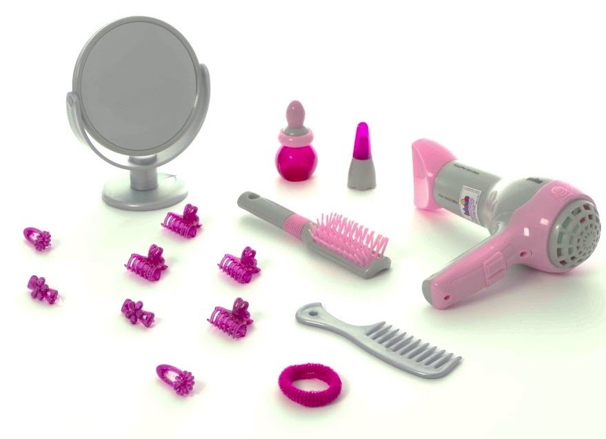 Чемоданчик стилиста с феном «Klein» — замечательный сюрприз для девочки от трех лет. В комплекте имеется все необходимое для создания неповторимой прически: фен, несколько расчесок, заколки, крабики, пластиковое зеркало на ножке, резиночка для волос. С помощью данного набора малышка почувствует себя настоящим стилистом и сможет делать прически своим любимым куколкам, подружкам или украшать свои волосы красивыми заколочками.